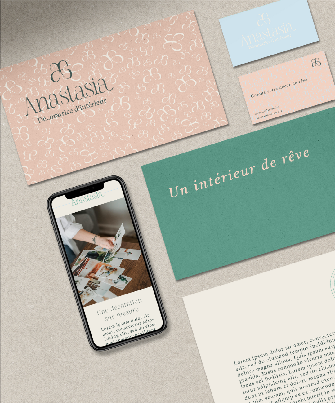 Voilà une identité visuelle tout en douceur et en inspiration : elle positionne Anastasia comme une créatrice de cocons, de décors de rêve. Les couleurs rappellent les couchers de soleil, la nature et les fleurs. La palette globale amène une sensation d’apaisement, de douceur. La typographie de titre tout en finesse, est l’élément le plus travaillé : tout est dans le détail. La hanse du A est redessinée pour être harmonieuse avec les autres lettres, certaines sont liées entre elles par une ligature, l’empattement de la pointe de certains «a» a été alourdi et la dernière branche du «a» final a été allongé pour évoquer une continuité, un infini. La deuxième typographie, celle des textes de labeur et de la baseline du logo, est plus classique, à empattement. L’illustration d’un papillon déployant ses ailes est créée en prenant deux «a» différents du logo «anastasia». Cet icône, avec tout l’univers du papillon, vient ajouter à l’effet de cocon, de chrysalide, de féerie, d’évolution, de fluidité et de beauté. Le tout apporte de l’harmonie, de l’équilibre et vient répondre au besoin d’inspirations de sa clientèle idéale.