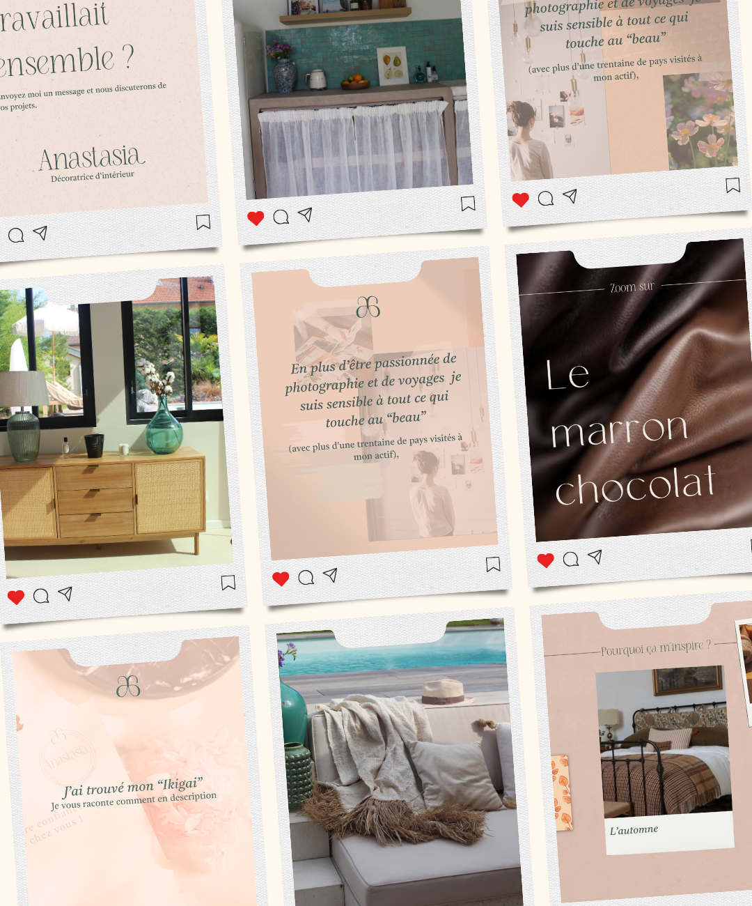 Anastasia est décoratrice d’intérieur pour des particuliers au caractère accueillant, chaleureux et parfois un peu rêveurs. Elle propose diverses offres, du sur mesure et des prestations à la carte. Son Envie : créer un espace dans lequel ses clients se sentent bien, leur cocon. Elle souhaite apporter sa petite touche tout en leur permettant d’avoir un espace où se décharger, chaleureux, bien agencé, réfléchi et qui leur ressemble : Réaliser leur intérieur de rêve, leur cocon utopique dans lequel leur vie s’améliore instantanément. Elle décore pour des gens qui vont travailler, être à l’extérieur et, quand ils rentrent, ils doivent pouvoir laisser leurs soucis sur le pas de la porte et se sentir bien chez eux. Son identité visuelle doit retranscrire cette mission qu’elle s’est donné, la raconter à sa clientèle idéale.